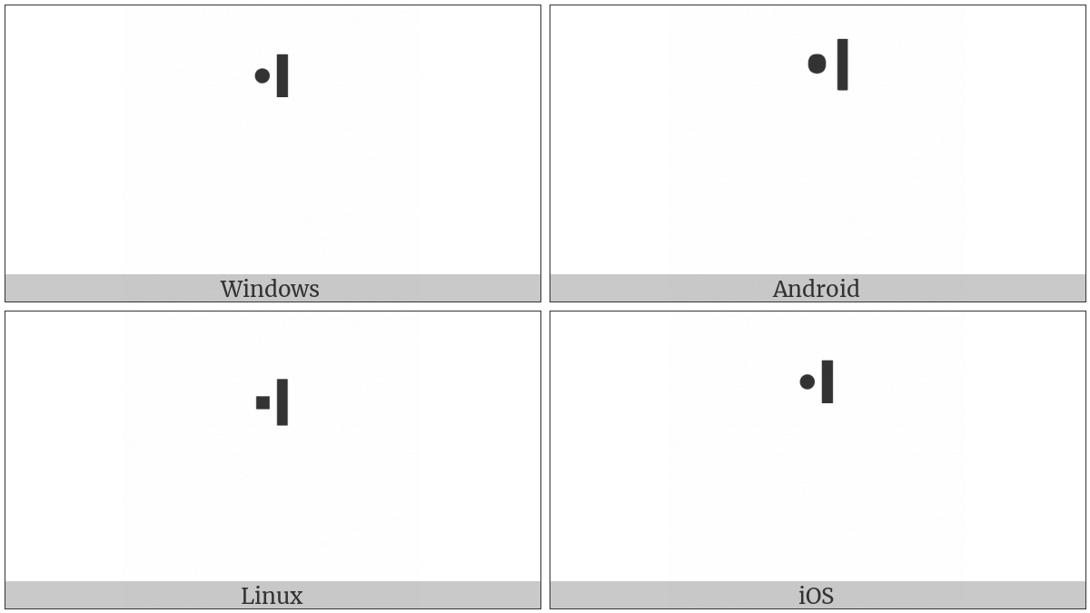 The image below shows how the “Modifier Letter Dot Vertical Bar” symbol might look like on different operating systems. If the font in which this web site is displayed does not contain the symbol and there is no fallback font able to render it, you can use the image below to get an idea of what it should look like.