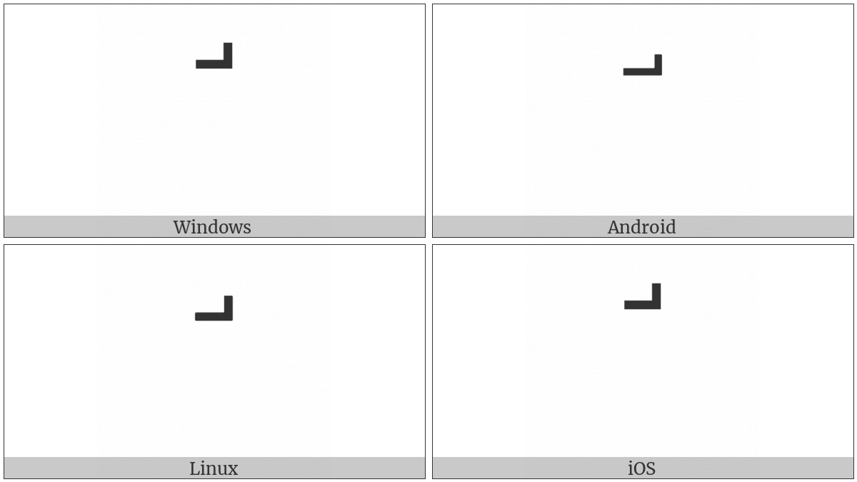 The image below shows how the “Modifier Letter Lower Right Corner Angle” symbol might look like on different operating systems. If the font in which this web site is displayed does not contain the symbol and there is no fallback font able to render it, you can use the image below to get an idea of what it should look like.