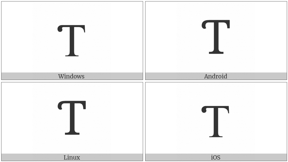 The image below shows how the “Latin Capital Letter T With Hook” symbol might look like on different operating systems. If the font in which this web site is displayed does not contain the symbol and there is no fallback font able to render it, you can use the image below to get an idea of what it should look like.