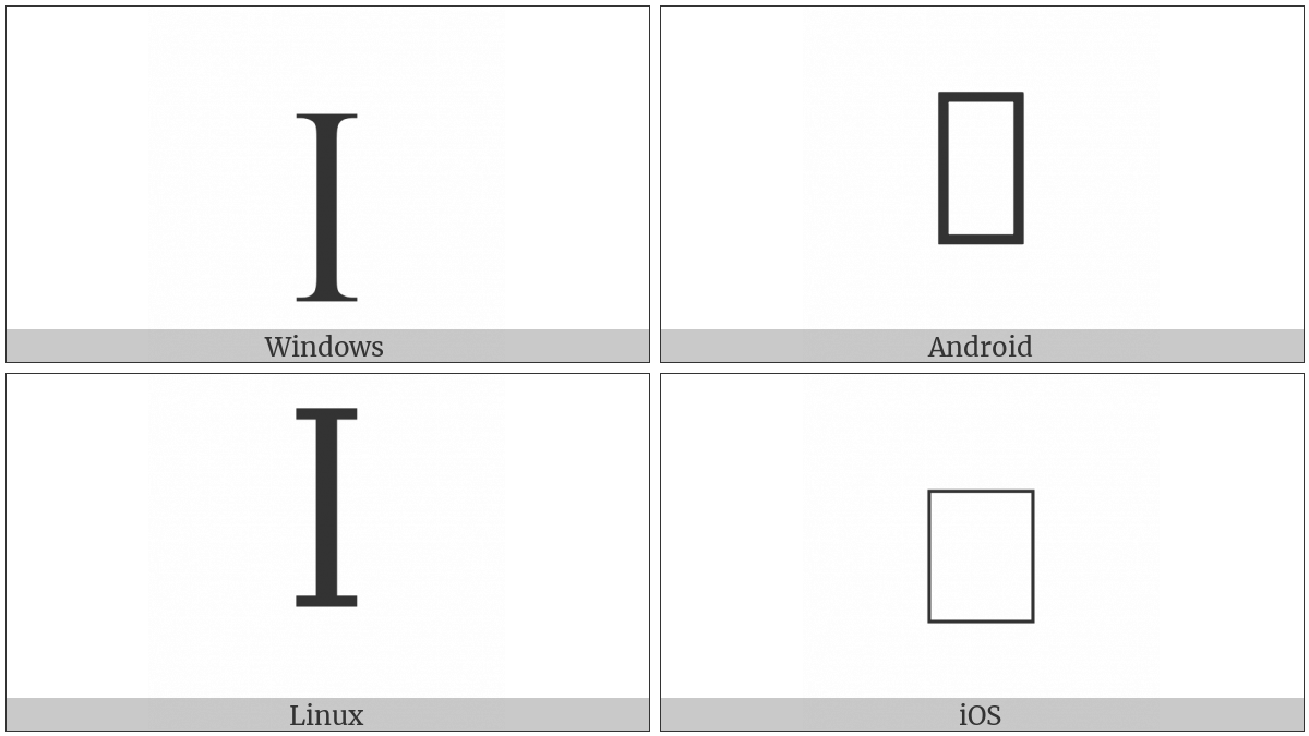 The image below shows how the “Latin Epigraphic Letter I Longa” symbol might look like on different operating systems. If the font in which this web site is displayed does not contain the symbol and there is no fallback font able to render it, you can use the image below to get an idea of what it should look like.