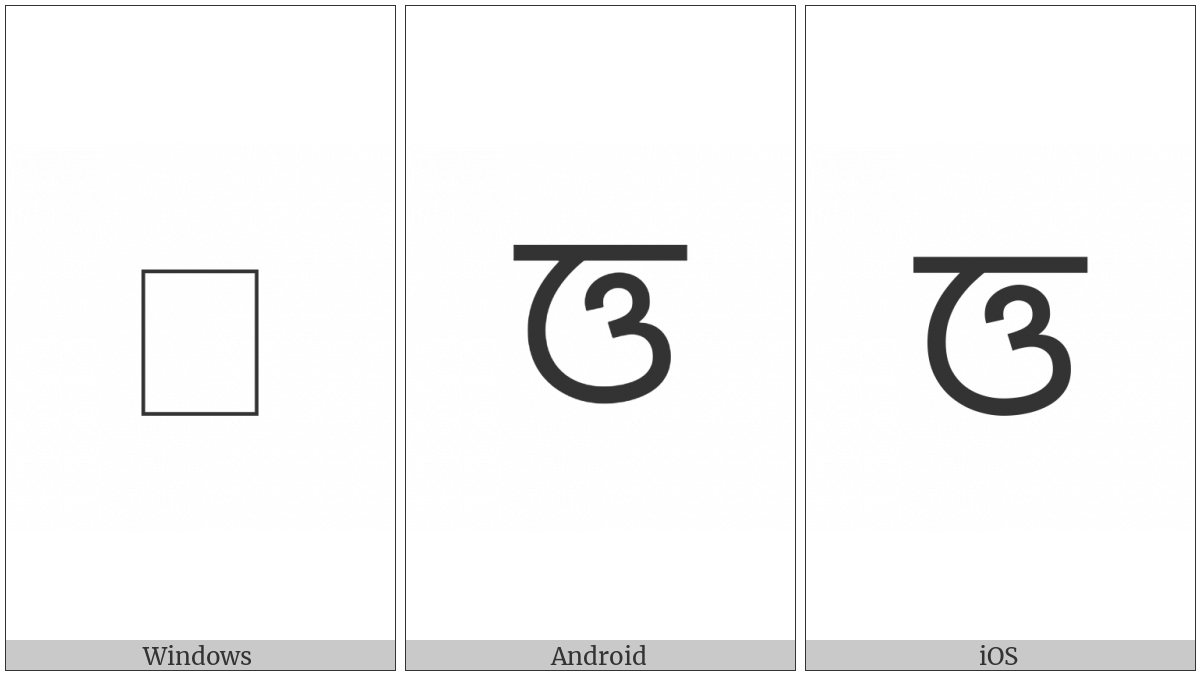 The image below shows how the “Syloti Nagri Letter U” symbol might look like on different operating systems. If the font in which this web site is displayed does not contain the symbol and there is no fallback font able to render it, you can use the image below to get an idea of what it should look like.