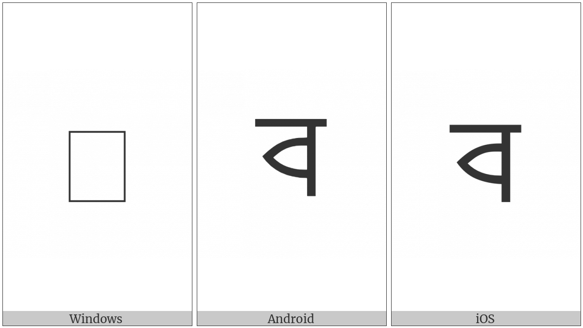 The image below shows how the “Syloti Nagri Letter Co” symbol might look like on different operating systems. If the font in which this web site is displayed does not contain the symbol and there is no fallback font able to render it, you can use the image below to get an idea of what it should look like.