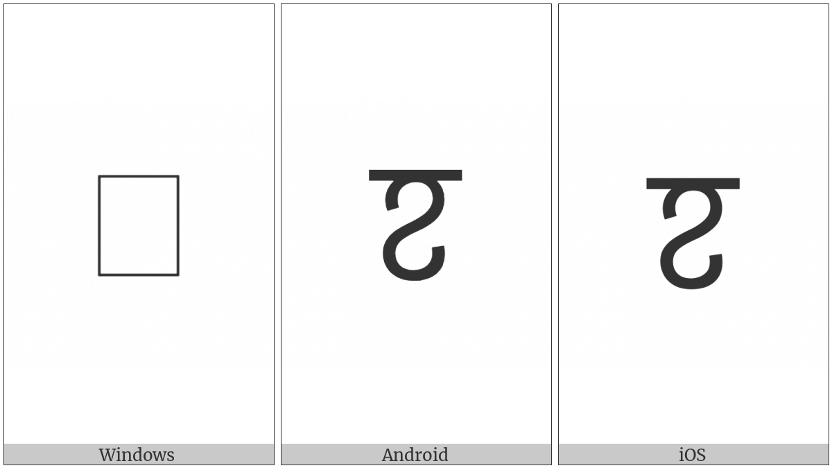 The image below shows how the “Syloti Nagri Letter Tto” symbol might look like on different operating systems. If the font in which this web site is displayed does not contain the symbol and there is no fallback font able to render it, you can use the image below to get an idea of what it should look like.
