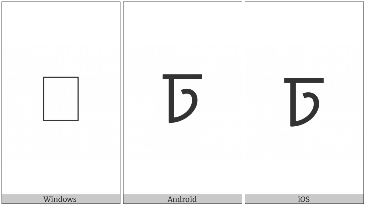 The image below shows how the “Syloti Nagri Letter Ttho” symbol might look like on different operating systems. If the font in which this web site is displayed does not contain the symbol and there is no fallback font able to render it, you can use the image below to get an idea of what it should look like.