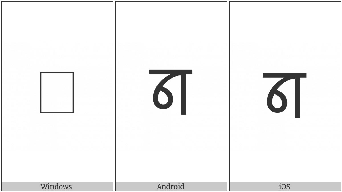 The image below shows how the “Syloti Nagri Letter No” symbol might look like on different operating systems. If the font in which this web site is displayed does not contain the symbol and there is no fallback font able to render it, you can use the image below to get an idea of what it should look like.
