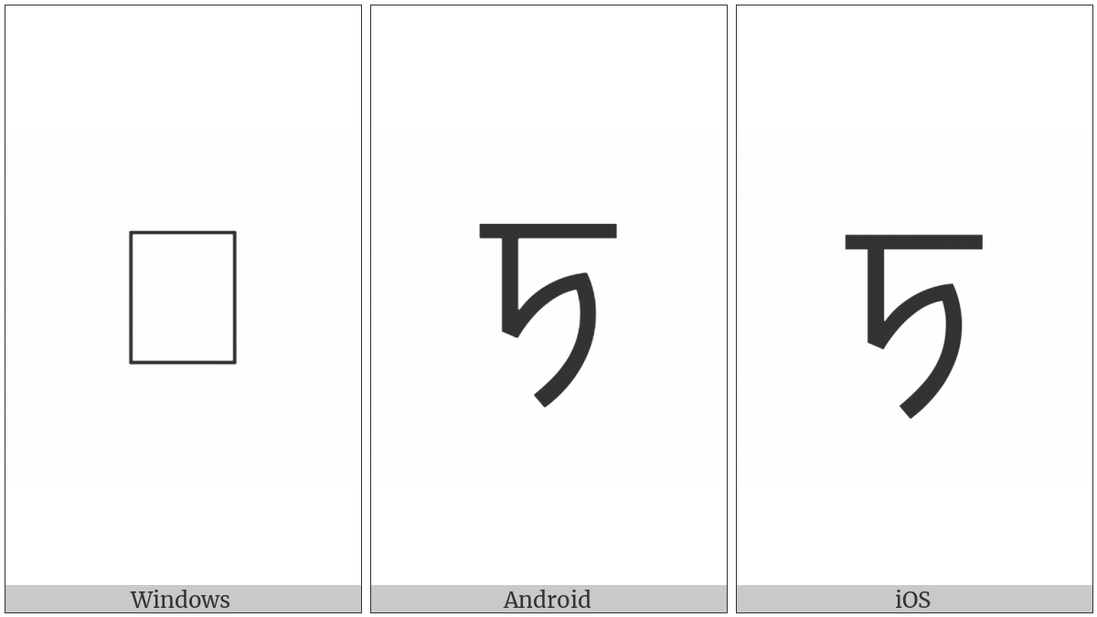 The image below shows how the “Syloti Nagri Letter Rro” symbol might look like on different operating systems. If the font in which this web site is displayed does not contain the symbol and there is no fallback font able to render it, you can use the image below to get an idea of what it should look like.