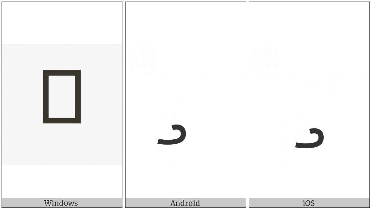 The image below shows how the “Syloti Nagri Vowel Sign U” symbol might look like on different operating systems. If the font in which this web site is displayed does not contain the symbol and there is no fallback font able to render it, you can use the image below to get an idea of what it should look like.