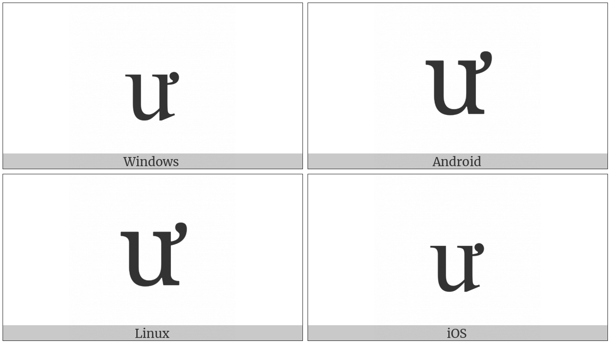The image below shows how the “Latin Small Letter U With Horn” symbol might look like on different operating systems. If the font in which this web site is displayed does not contain the symbol and there is no fallback font able to render it, you can use the image below to get an idea of what it should look like.