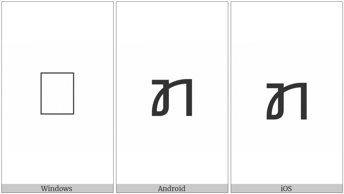 The image below shows how the “Kayah Li Letter Ka” symbol might look like on different operating systems. If the font in which this web site is displayed does not contain the symbol and there is no fallback font able to render it, you can use the image below to get an idea of what it should look like.