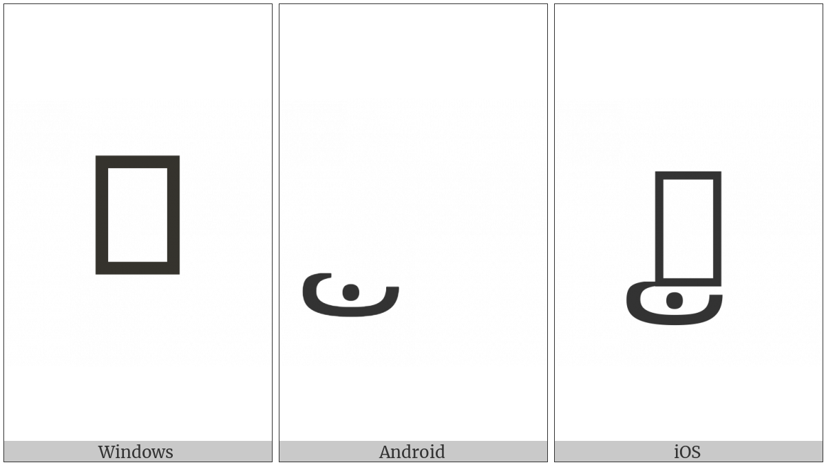 The image below shows how the “Kayah Li Tone Calya Plophu” symbol might look like on different operating systems. If the font in which this web site is displayed does not contain the symbol and there is no fallback font able to render it, you can use the image below to get an idea of what it should look like.