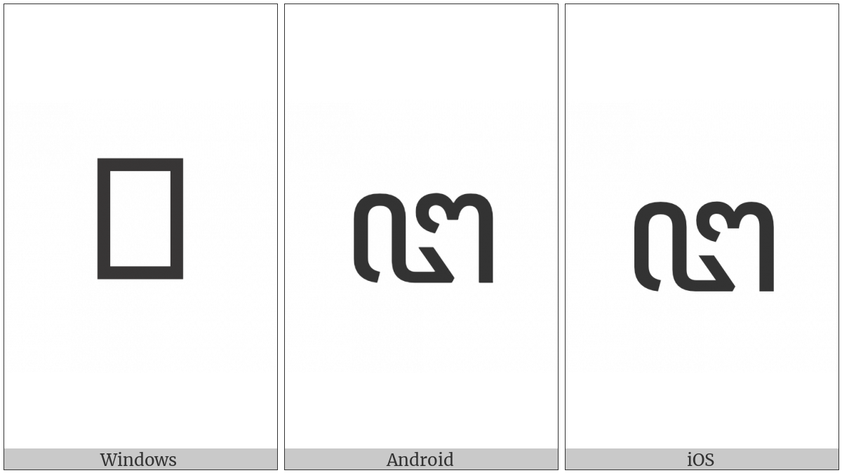 The image below shows how the “Javanese Letter Nga” symbol might look like on different operating systems. If the font in which this web site is displayed does not contain the symbol and there is no fallback font able to render it, you can use the image below to get an idea of what it should look like.