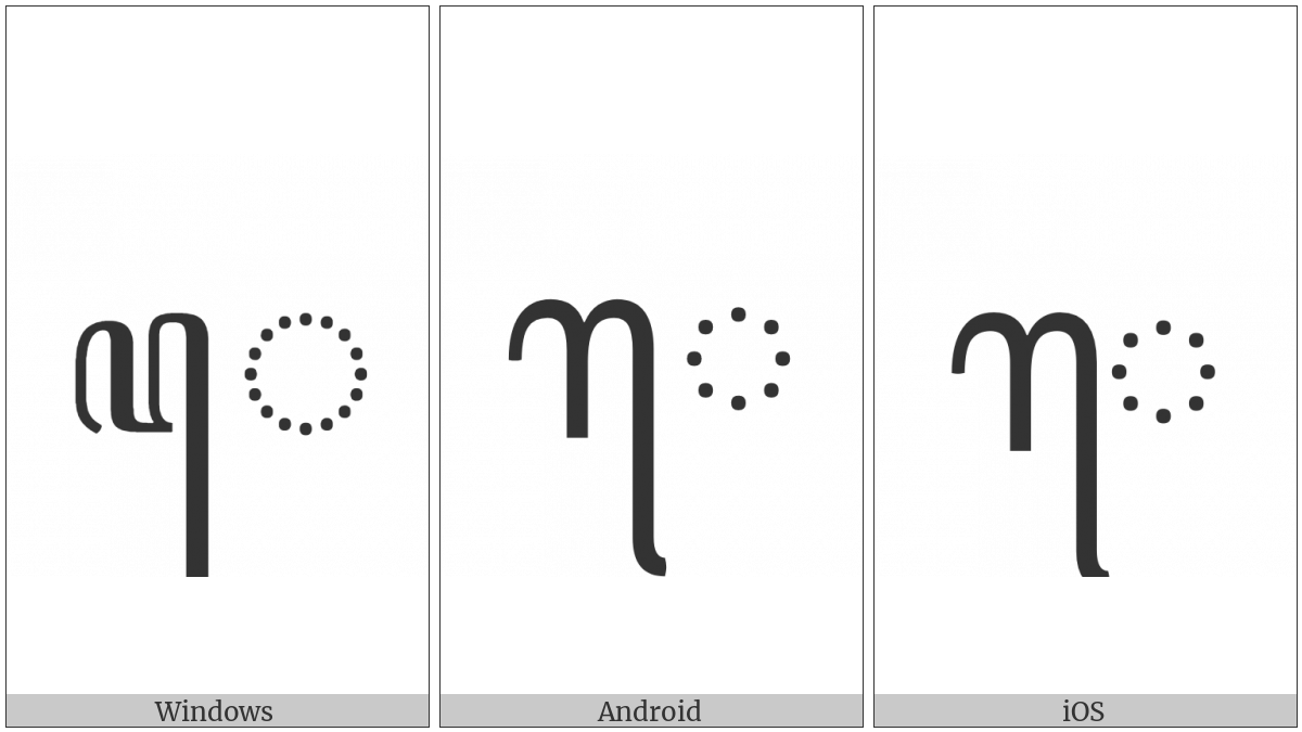 The image below shows how the “Javanese Vowel Sign Taling” symbol might look like on different operating systems. If the font in which this web site is displayed does not contain the symbol and there is no fallback font able to render it, you can use the image below to get an idea of what it should look like.