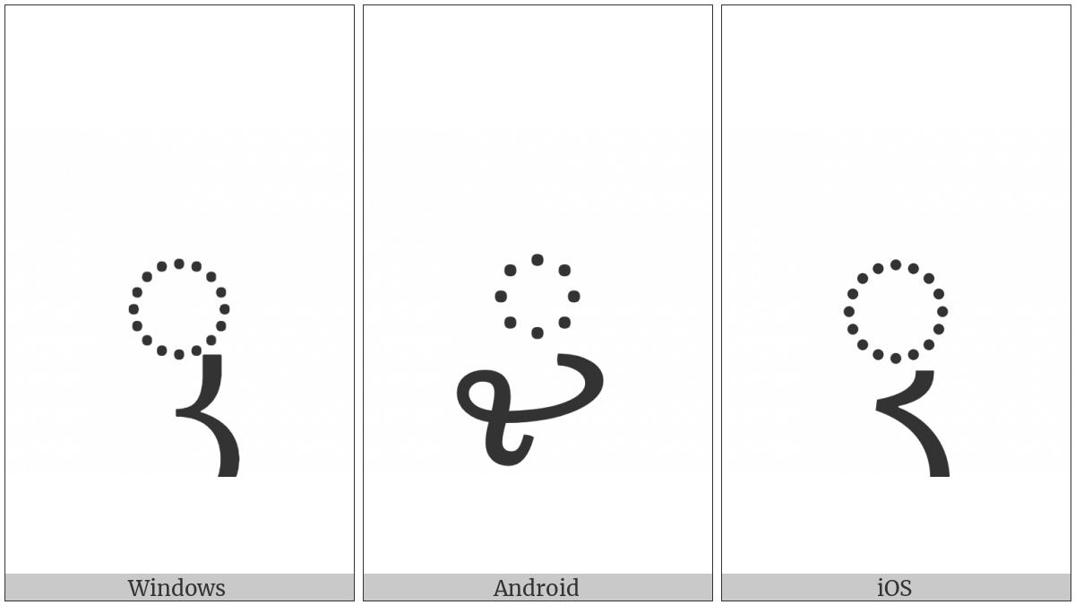 The image below shows how the “Javanese Consonant Sign Keret” symbol might look like on different operating systems. If the font in which this web site is displayed does not contain the symbol and there is no fallback font able to render it, you can use the image below to get an idea of what it should look like.