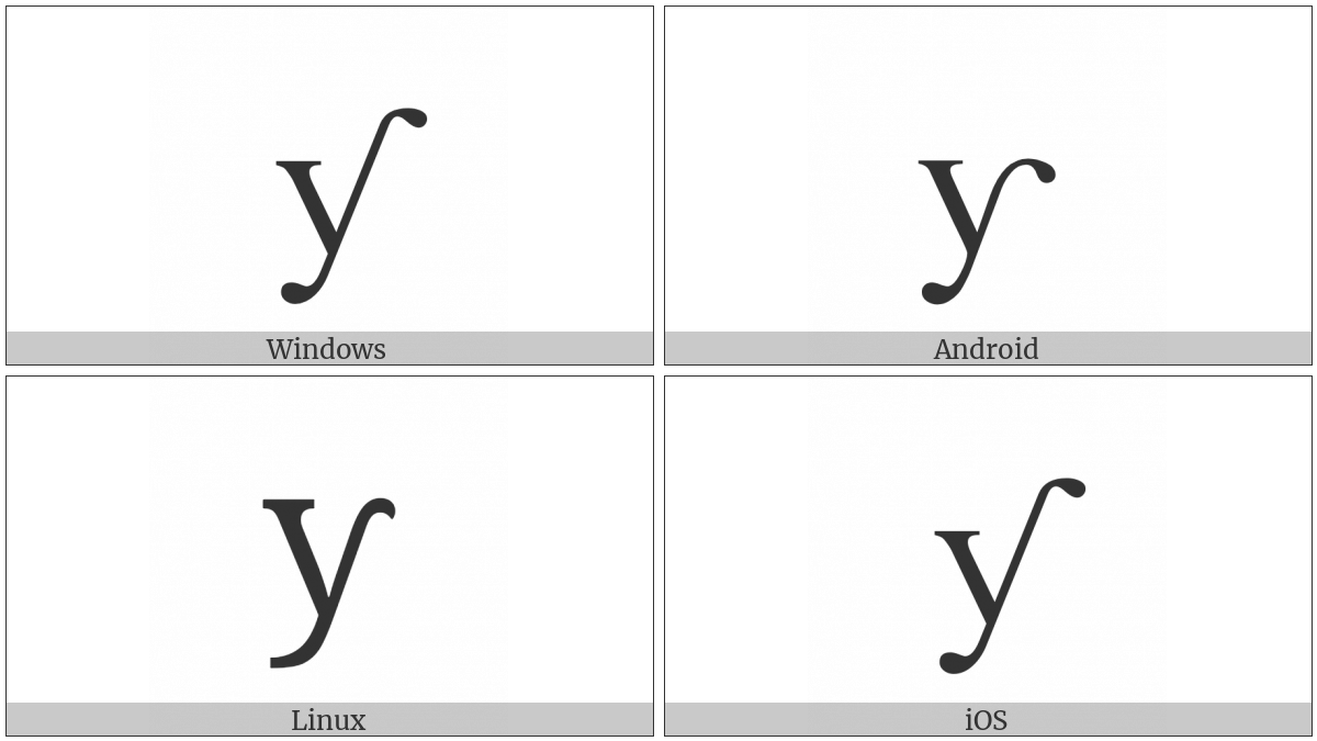 The image below shows how the “Latin Small Letter Y With Hook” symbol might look like on different operating systems. If the font in which this web site is displayed does not contain the symbol and there is no fallback font able to render it, you can use the image below to get an idea of what it should look like.