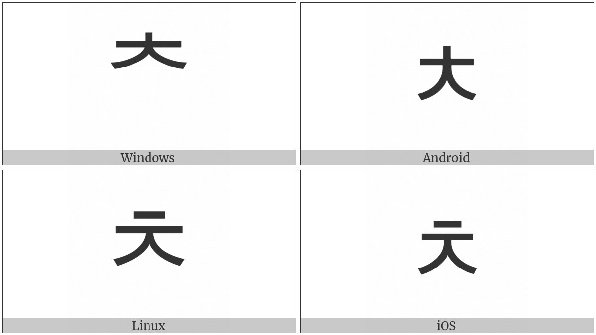 The image below shows how the “Hangul Choseong Chieuch” symbol might look like on different operating systems. If the font in which this web site is displayed does not contain the symbol and there is no fallback font able to render it, you can use the image below to get an idea of what it should look like.