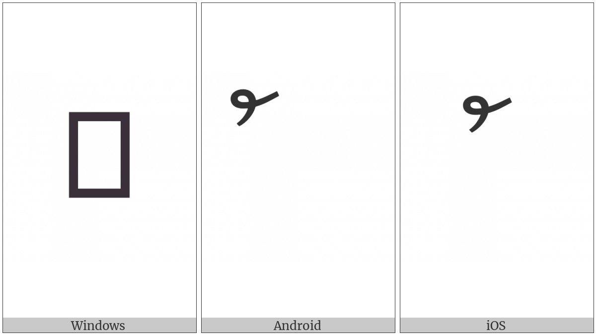 The image below shows how the “Tai Viet Vowel Ue” symbol might look like on different operating systems. If the font in which this web site is displayed does not contain the symbol and there is no fallback font able to render it, you can use the image below to get an idea of what it should look like.