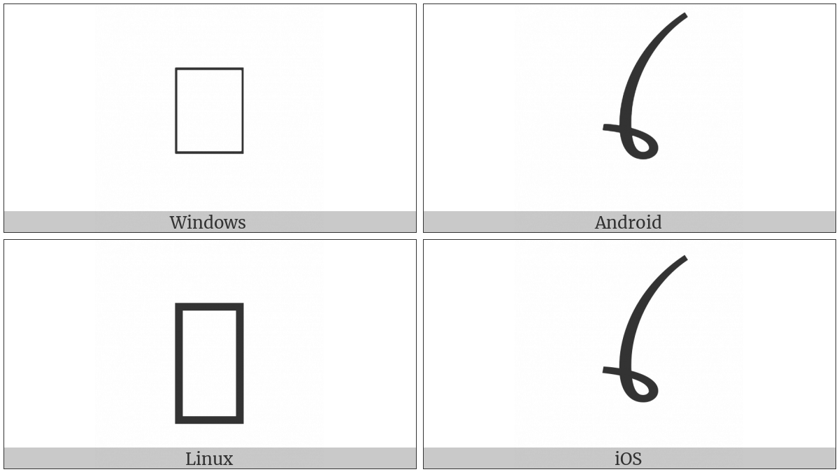 The image below shows how the “Tai Viet Vowel O” symbol might look like on different operating systems. If the font in which this web site is displayed does not contain the symbol and there is no fallback font able to render it, you can use the image below to get an idea of what it should look like.