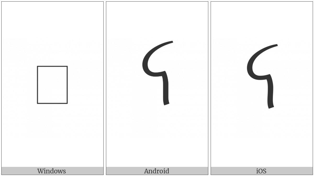 The image below shows how the “Tai Viet Vowel Ay” symbol might look like on different operating systems. If the font in which this web site is displayed does not contain the symbol and there is no fallback font able to render it, you can use the image below to get an idea of what it should look like.