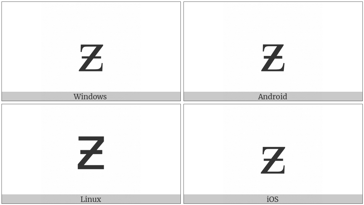 The image below shows how the “Latin Small Letter Z With Stroke” symbol might look like on different operating systems. If the font in which this web site is displayed does not contain the symbol and there is no fallback font able to render it, you can use the image below to get an idea of what it should look like.
