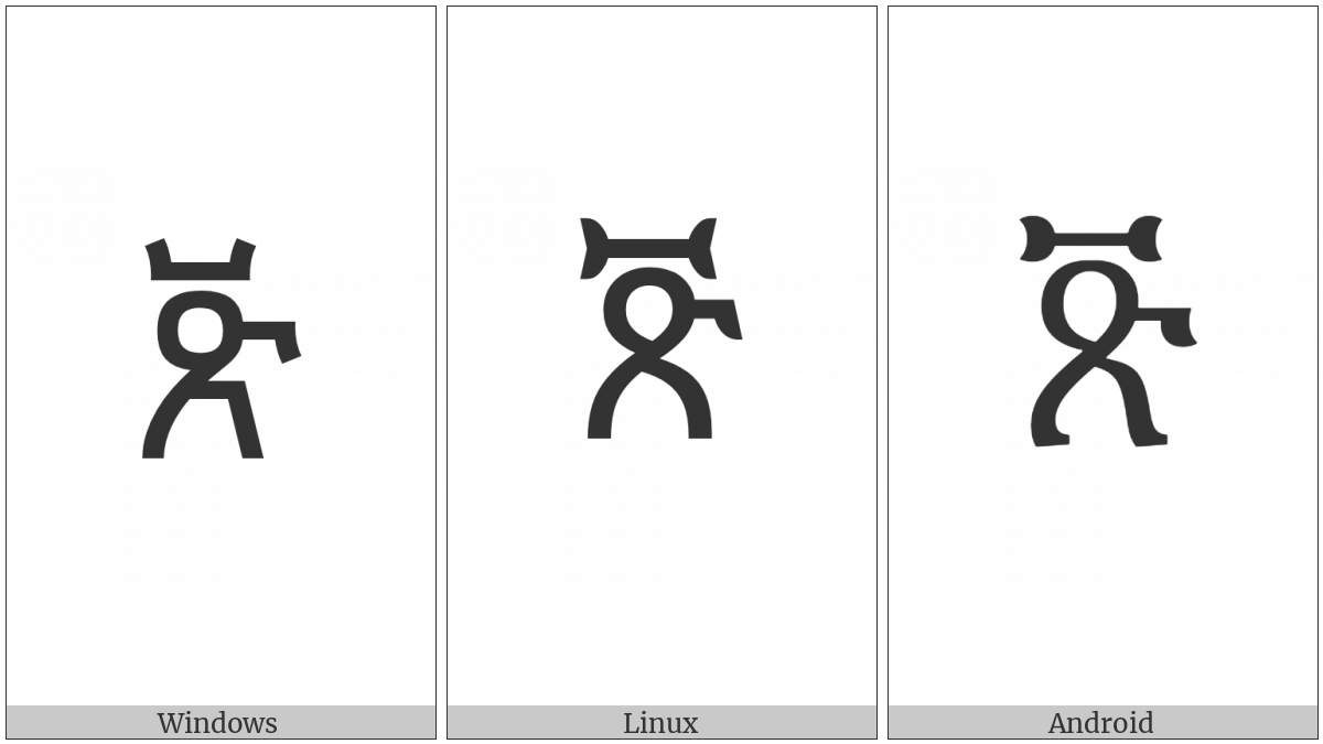 The image below shows how the “Ethiopic Syllable Bbe” symbol might look like on different operating systems. If the font in which this web site is displayed does not contain the symbol and there is no fallback font able to render it, you can use the image below to get an idea of what it should look like.