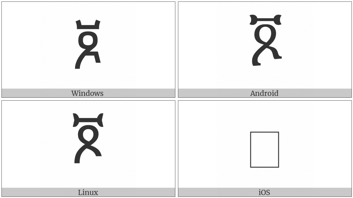 The image below shows how the “Ethiopic Syllable Bbo” symbol might look like on different operating systems. If the font in which this web site is displayed does not contain the symbol and there is no fallback font able to render it, you can use the image below to get an idea of what it should look like.