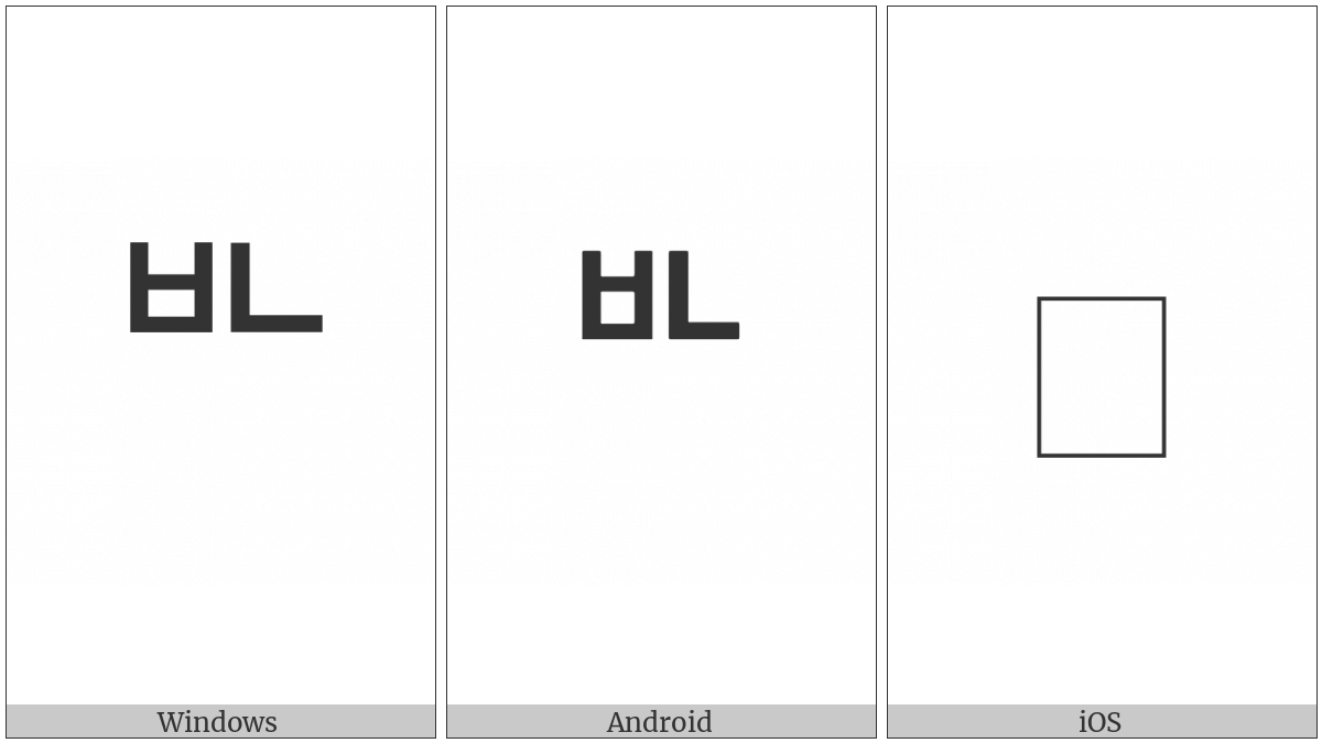The image below shows how the “Hangul Choseong Pieup-Nieun” symbol might look like on different operating systems. If the font in which this web site is displayed does not contain the symbol and there is no fallback font able to render it, you can use the image below to get an idea of what it should look like.