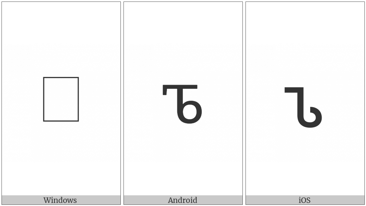 The image below shows how the “Cherokee Small Letter Te” symbol might look like on different operating systems. If the font in which this web site is displayed does not contain the symbol and there is no fallback font able to render it, you can use the image below to get an idea of what it should look like.