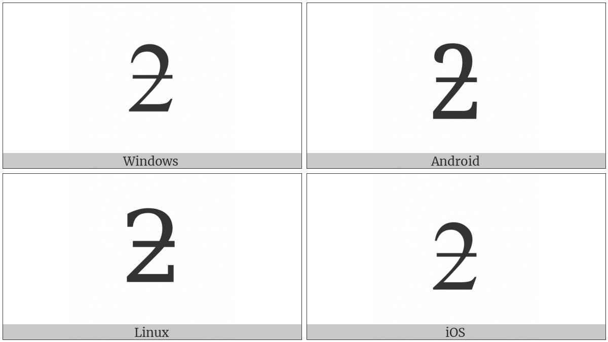 The image below shows how the “Latin Letter Two With Stroke” symbol might look like on different operating systems. If the font in which this web site is displayed does not contain the symbol and there is no fallback font able to render it, you can use the image below to get an idea of what it should look like.