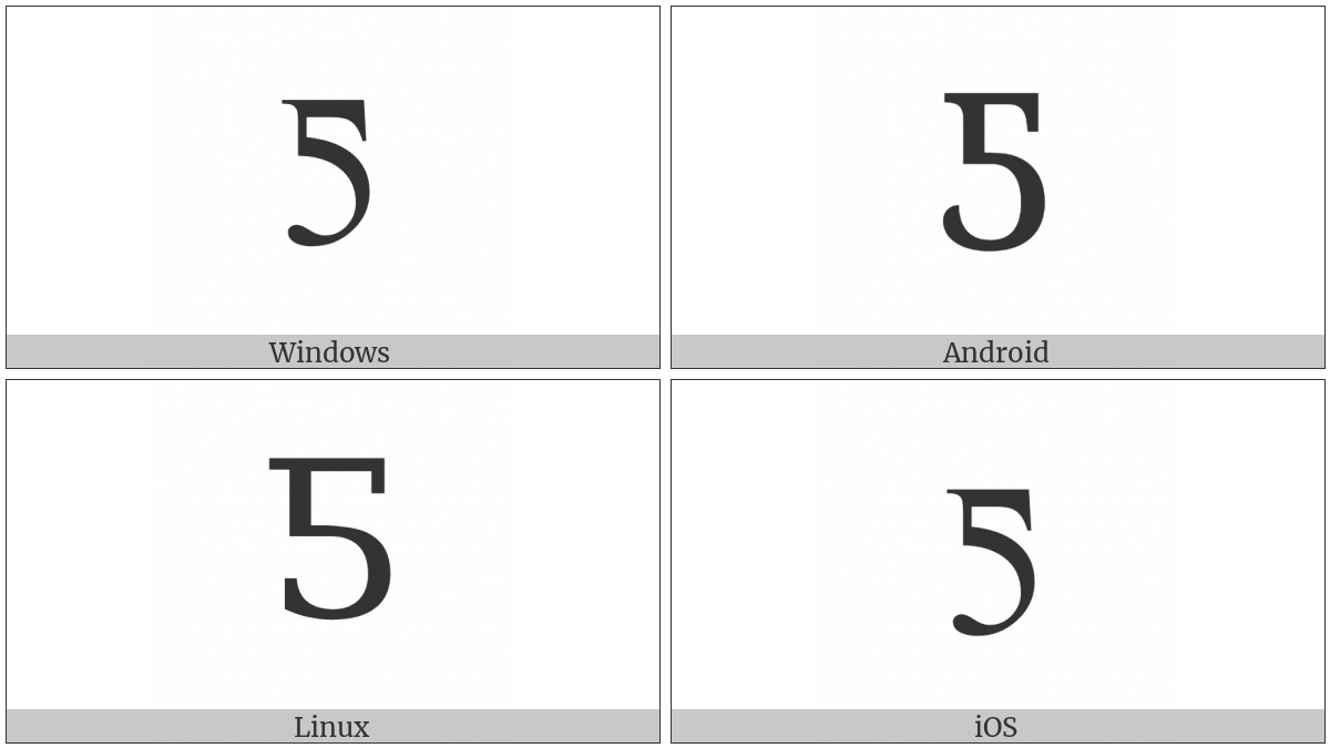 The image below shows how the “Latin Capital Letter Tone Five” symbol might look like on different operating systems. If the font in which this web site is displayed does not contain the symbol and there is no fallback font able to render it, you can use the image below to get an idea of what it should look like.