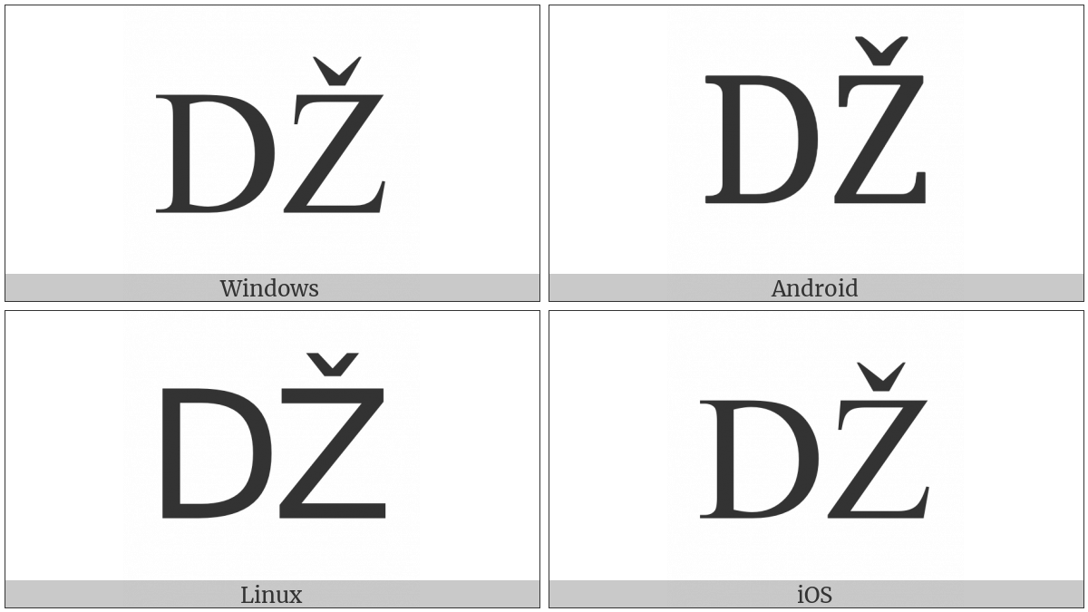 The image below shows how the “Latin Capital Letter Dz With Caron” symbol might look like on different operating systems. If the font in which this web site is displayed does not contain the symbol and there is no fallback font able to render it, you can use the image below to get an idea of what it should look like.