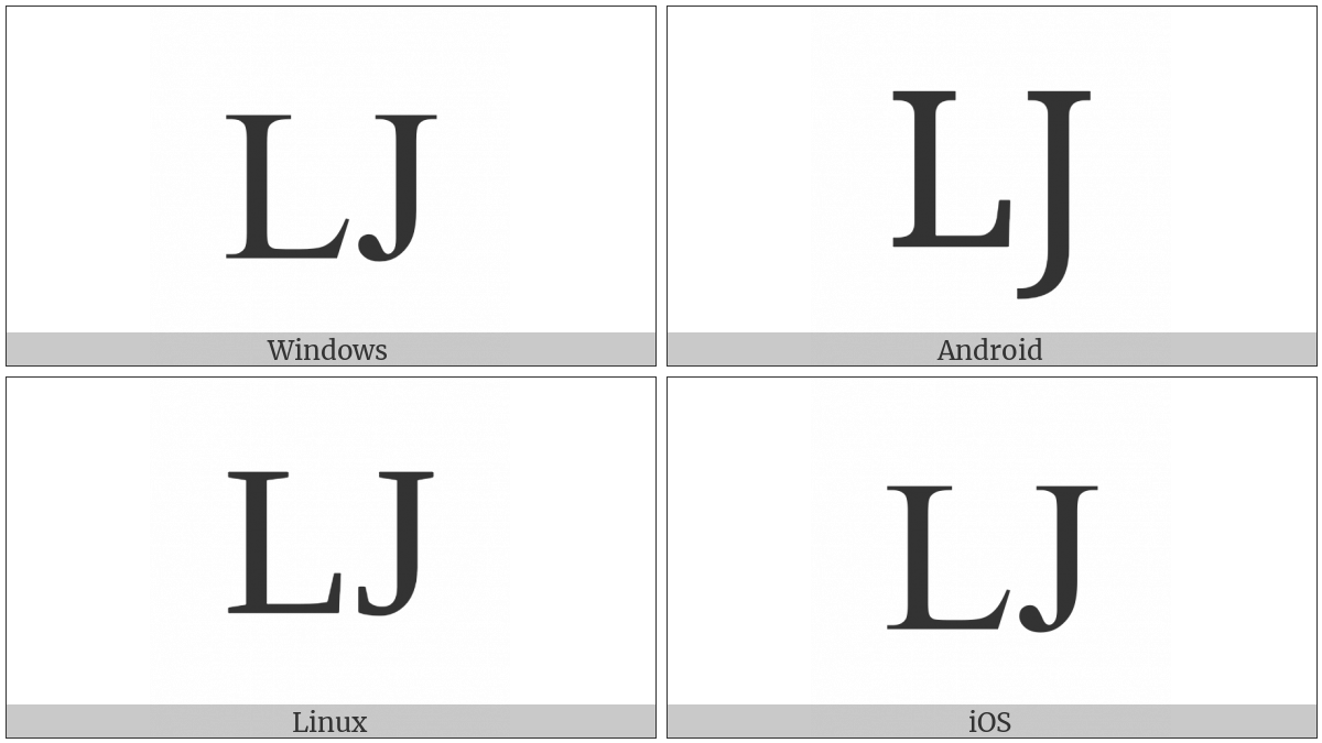 The image below shows how the “Latin Capital Letter Lj” symbol might look like on different operating systems. If the font in which this web site is displayed does not contain the symbol and there is no fallback font able to render it, you can use the image below to get an idea of what it should look like.