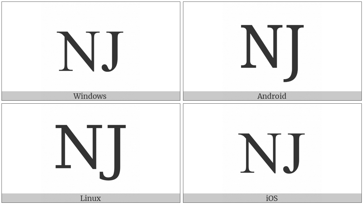The image below shows how the “Latin Capital Letter Nj” symbol might look like on different operating systems. If the font in which this web site is displayed does not contain the symbol and there is no fallback font able to render it, you can use the image below to get an idea of what it should look like.