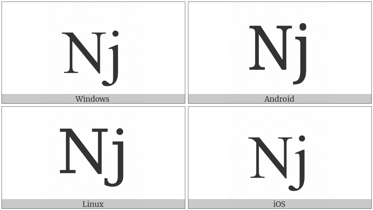 The image below shows how the “Latin Capital Letter N With Small Letter J” symbol might look like on different operating systems. If the font in which this web site is displayed does not contain the symbol and there is no fallback font able to render it, you can use the image below to get an idea of what it should look like.