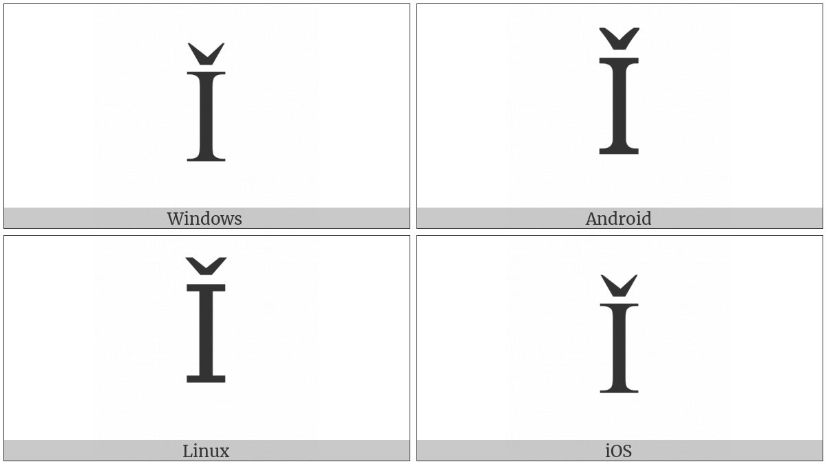 The image below shows how the “Latin Capital Letter I With Caron” symbol might look like on different operating systems. If the font in which this web site is displayed does not contain the symbol and there is no fallback font able to render it, you can use the image below to get an idea of what it should look like.