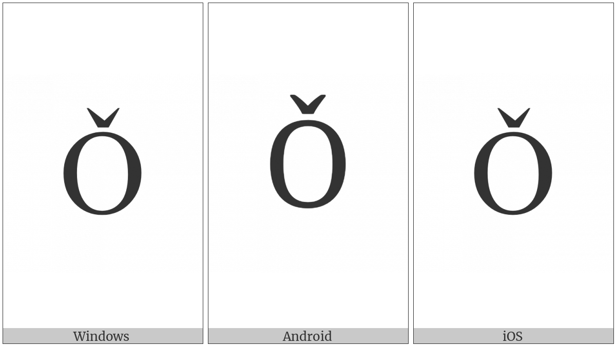 The image below shows how the “Latin Capital Letter O With Caron” symbol might look like on different operating systems. If the font in which this web site is displayed does not contain the symbol and there is no fallback font able to render it, you can use the image below to get an idea of what it should look like.
