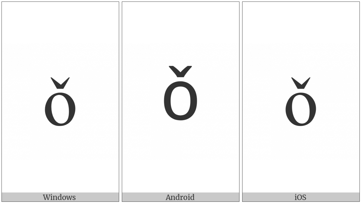 The image below shows how the “Latin Small Letter O With Caron” symbol might look like on different operating systems. If the font in which this web site is displayed does not contain the symbol and there is no fallback font able to render it, you can use the image below to get an idea of what it should look like.