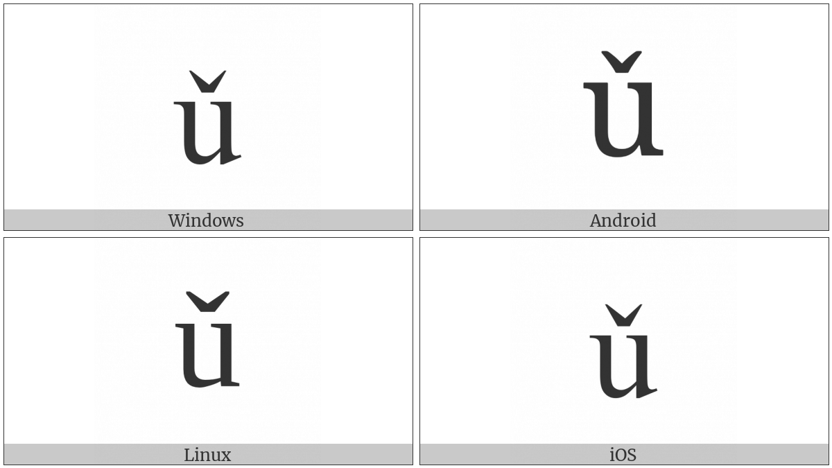 The image below shows how the “Latin Small Letter U With Caron” symbol might look like on different operating systems. If the font in which this web site is displayed does not contain the symbol and there is no fallback font able to render it, you can use the image below to get an idea of what it should look like.