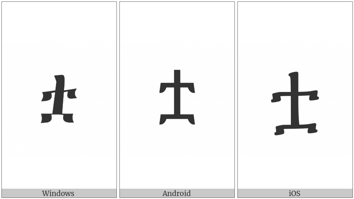 The image below shows how the “Ethiopic Syllable Twa” symbol might look like on different operating systems. If the font in which this web site is displayed does not contain the symbol and there is no fallback font able to render it, you can use the image below to get an idea of what it should look like.