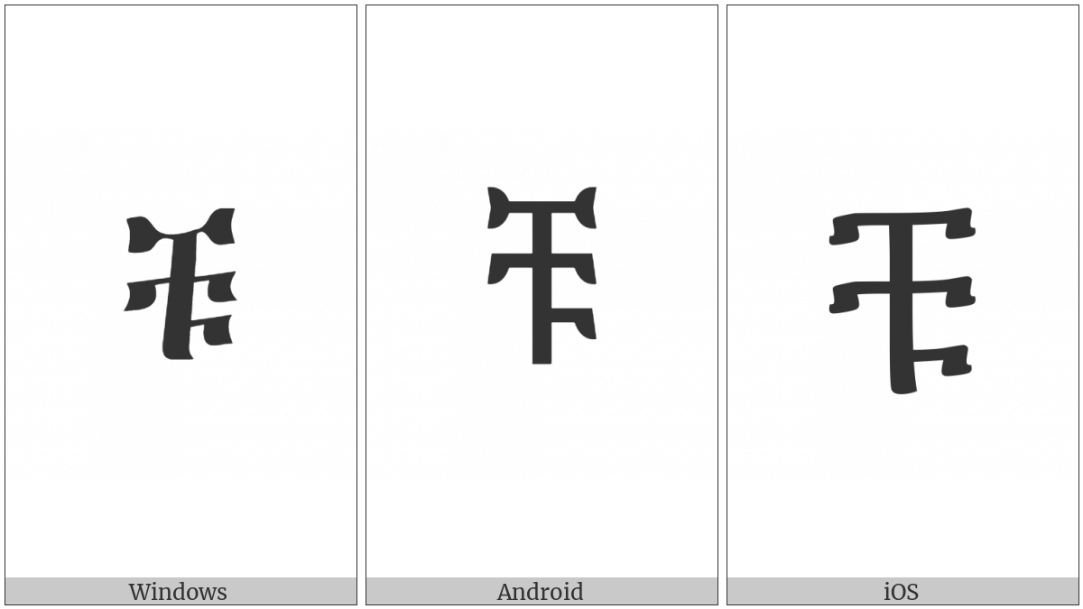 The image below shows how the “Ethiopic Syllable Cu” symbol might look like on different operating systems. If the font in which this web site is displayed does not contain the symbol and there is no fallback font able to render it, you can use the image below to get an idea of what it should look like.