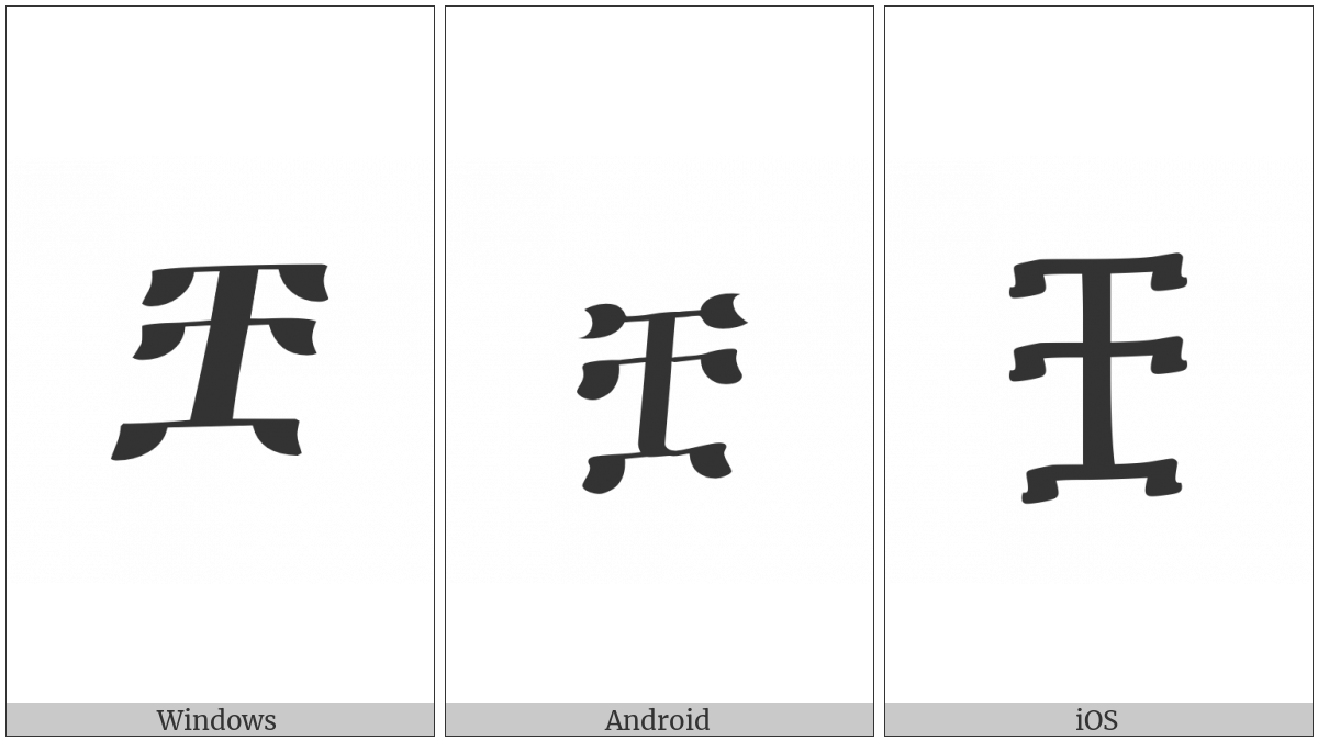 The image below shows how the “Ethiopic Syllable Cwa” symbol might look like on different operating systems. If the font in which this web site is displayed does not contain the symbol and there is no fallback font able to render it, you can use the image below to get an idea of what it should look like.