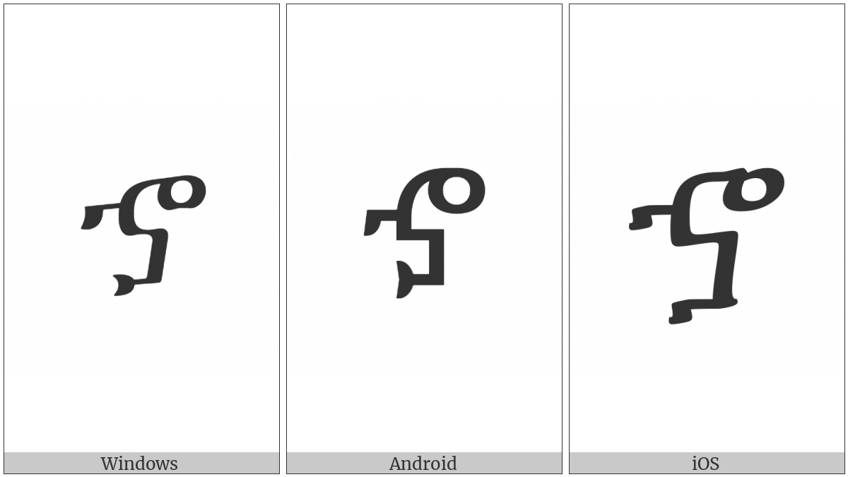 The image below shows how the “Ethiopic Syllable Xoa” symbol might look like on different operating systems. If the font in which this web site is displayed does not contain the symbol and there is no fallback font able to render it, you can use the image below to get an idea of what it should look like.