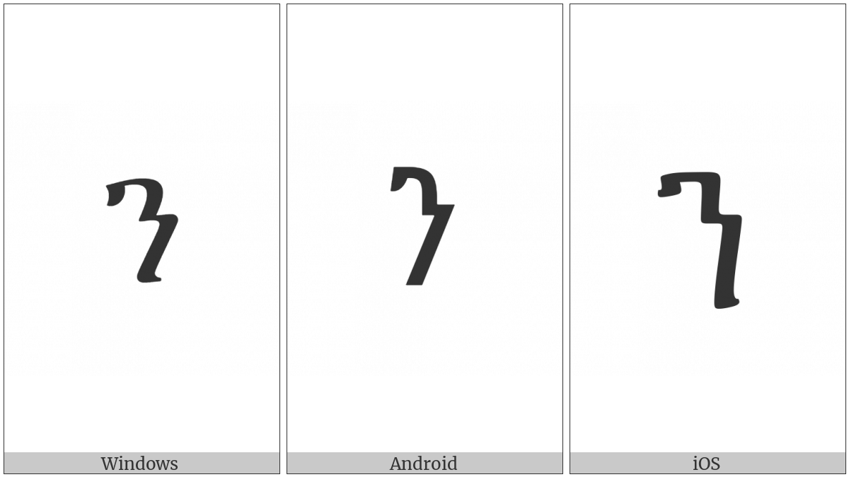 The image below shows how the “Ethiopic Syllable Ne” symbol might look like on different operating systems. If the font in which this web site is displayed does not contain the symbol and there is no fallback font able to render it, you can use the image below to get an idea of what it should look like.
