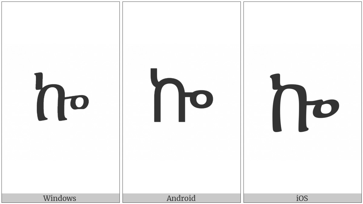 The image below shows how the “Ethiopic Syllable Kwa” symbol might look like on different operating systems. If the font in which this web site is displayed does not contain the symbol and there is no fallback font able to render it, you can use the image below to get an idea of what it should look like.