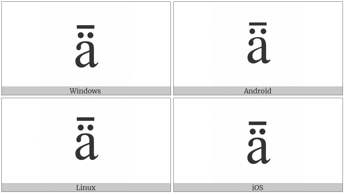 The image below shows how the “Latin Small Letter A With Diaeresis And Macron” symbol might look like on different operating systems. If the font in which this web site is displayed does not contain the symbol and there is no fallback font able to render it, you can use the image below to get an idea of what it should look like.