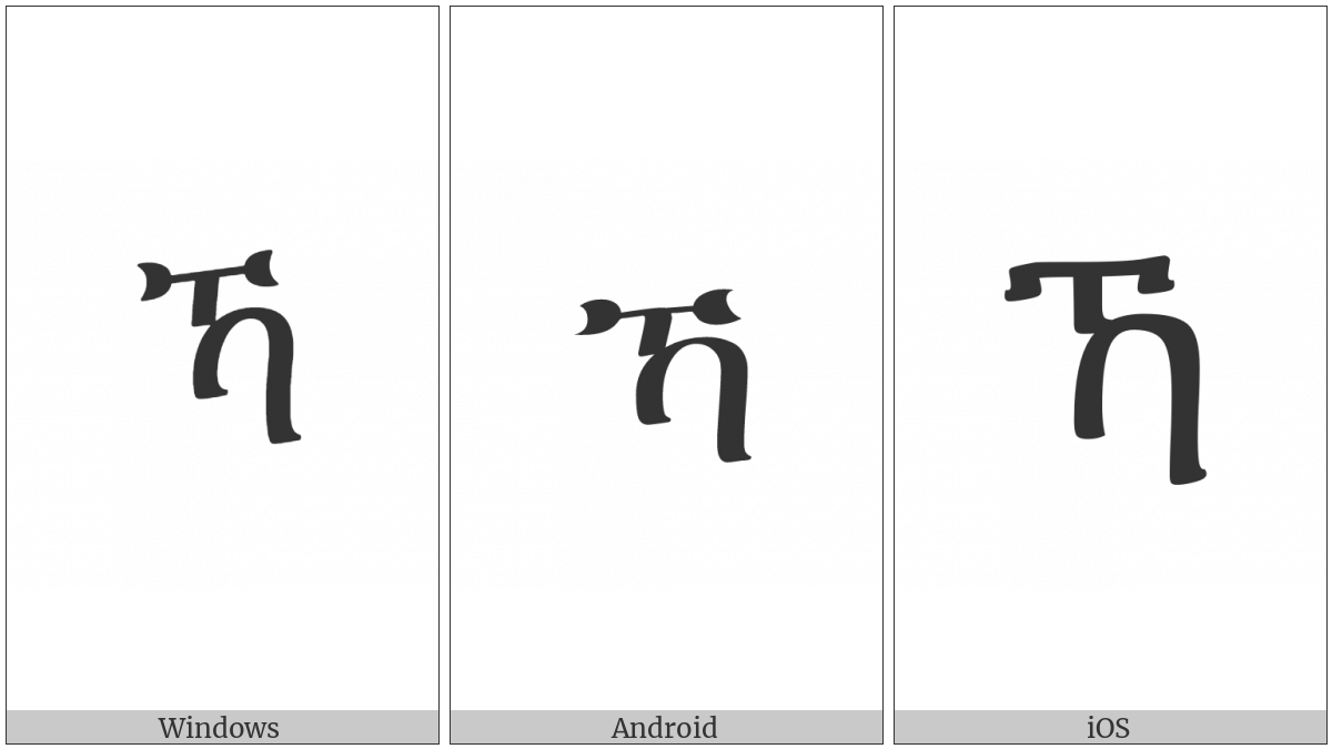 The image below shows how the “Ethiopic Syllable Kxaa” symbol might look like on different operating systems. If the font in which this web site is displayed does not contain the symbol and there is no fallback font able to render it, you can use the image below to get an idea of what it should look like.