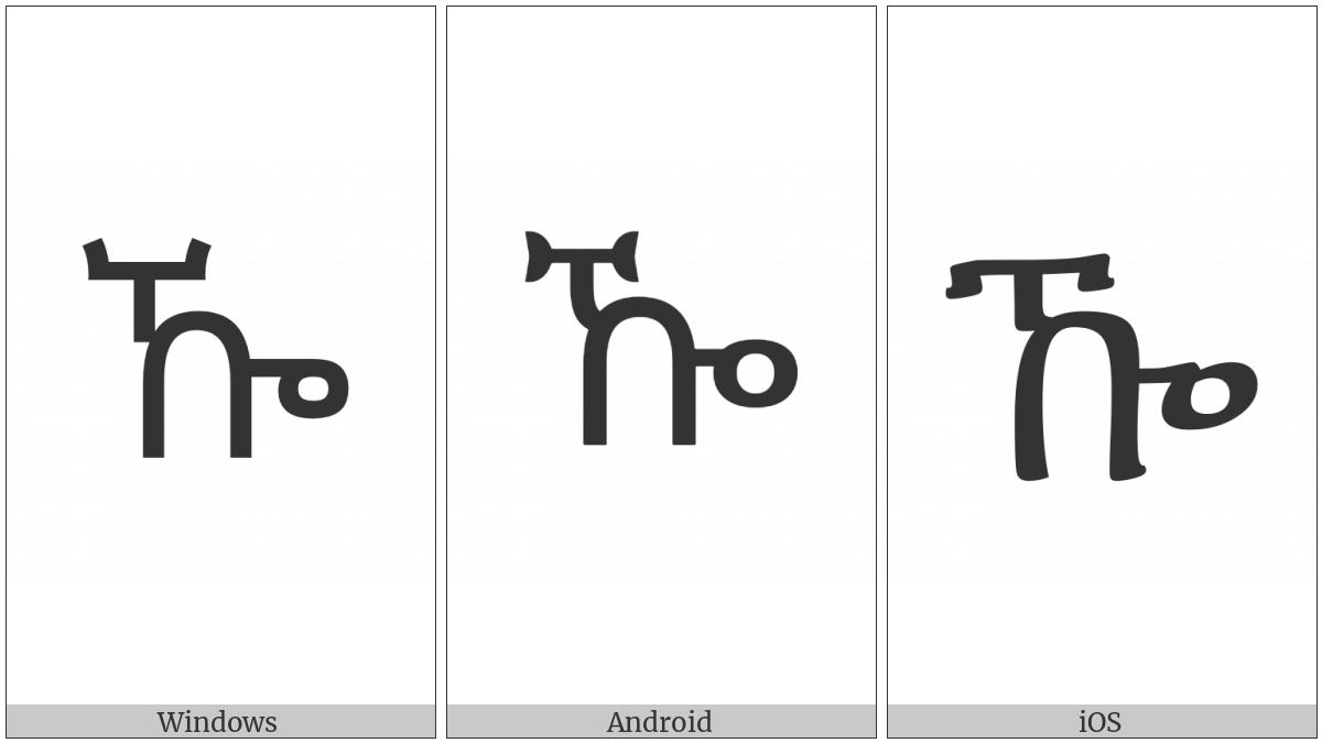 The image below shows how the “Ethiopic Syllable Kxwa” symbol might look like on different operating systems. If the font in which this web site is displayed does not contain the symbol and there is no fallback font able to render it, you can use the image below to get an idea of what it should look like.