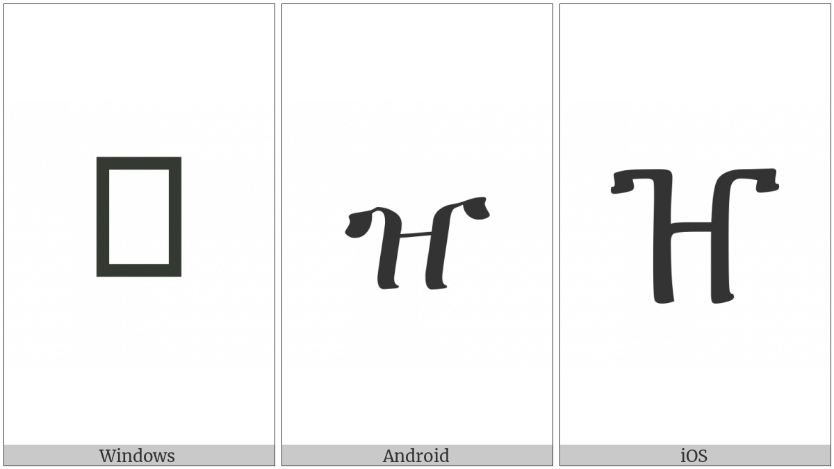 The image below shows how the “Ethiopic Syllable Zha” symbol might look like on different operating systems. If the font in which this web site is displayed does not contain the symbol and there is no fallback font able to render it, you can use the image below to get an idea of what it should look like.