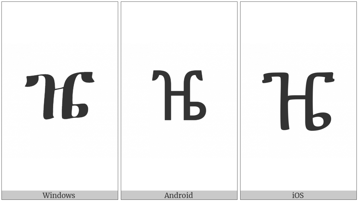 The image below shows how the “Ethiopic Syllable Zhee” symbol might look like on different operating systems. If the font in which this web site is displayed does not contain the symbol and there is no fallback font able to render it, you can use the image below to get an idea of what it should look like.