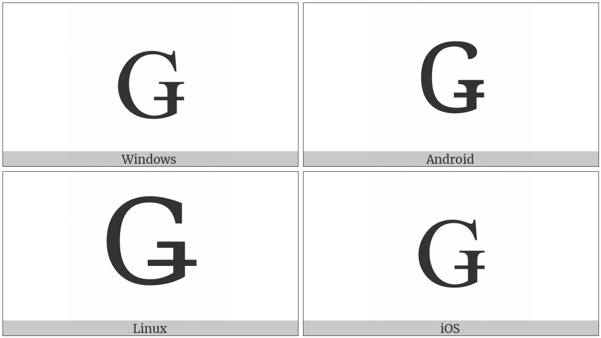 The image below shows how the “Latin Capital Letter G With Stroke” symbol might look like on different operating systems. If the font in which this web site is displayed does not contain the symbol and there is no fallback font able to render it, you can use the image below to get an idea of what it should look like.