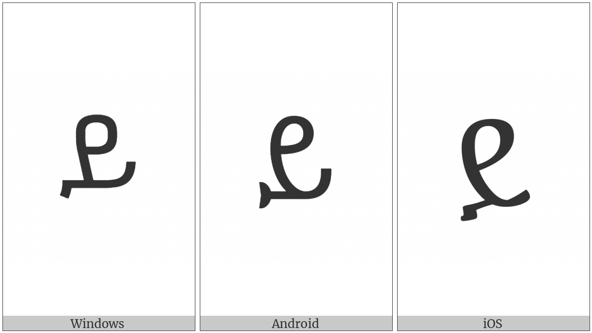 The image below shows how the “Ethiopic Syllable Ye” symbol might look like on different operating systems. If the font in which this web site is displayed does not contain the symbol and there is no fallback font able to render it, you can use the image below to get an idea of what it should look like.
